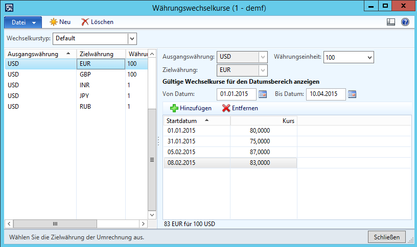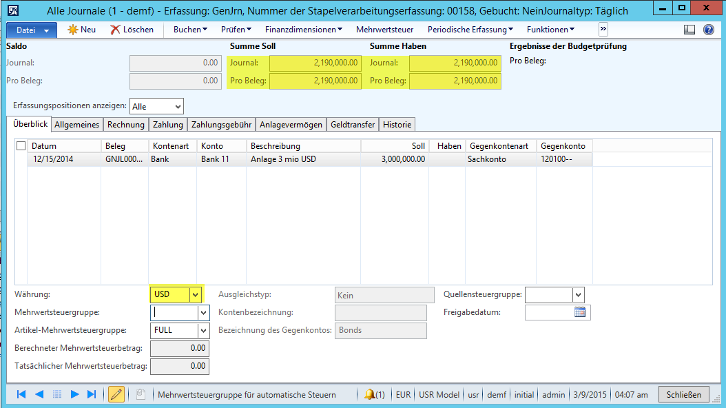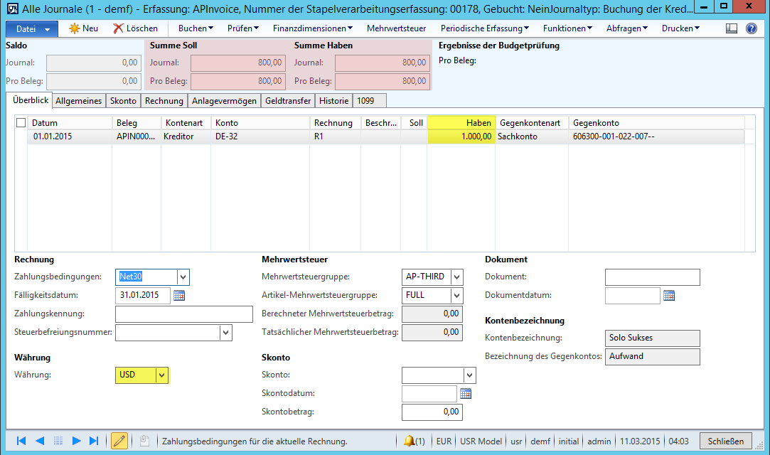 Ausgehend von diesen Wechselkursen wird am 1 Januar 2015 zunächst eine Kreditorenrechnung in Höhe von 1000 USD in einem Kreditorenrechnungsjournal erfasst und gebucht. Aufgrund des zum Zeitpunkt der Rechnungsbuchung gültigen Wechselkurses von 80 EUR/100 USD ergibt sich ein zugehöriger EUR-Wert in Höhe von 800 EUR.