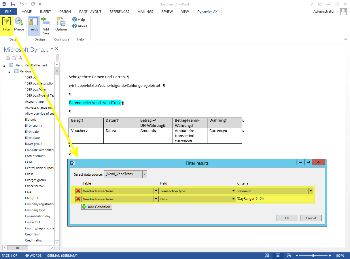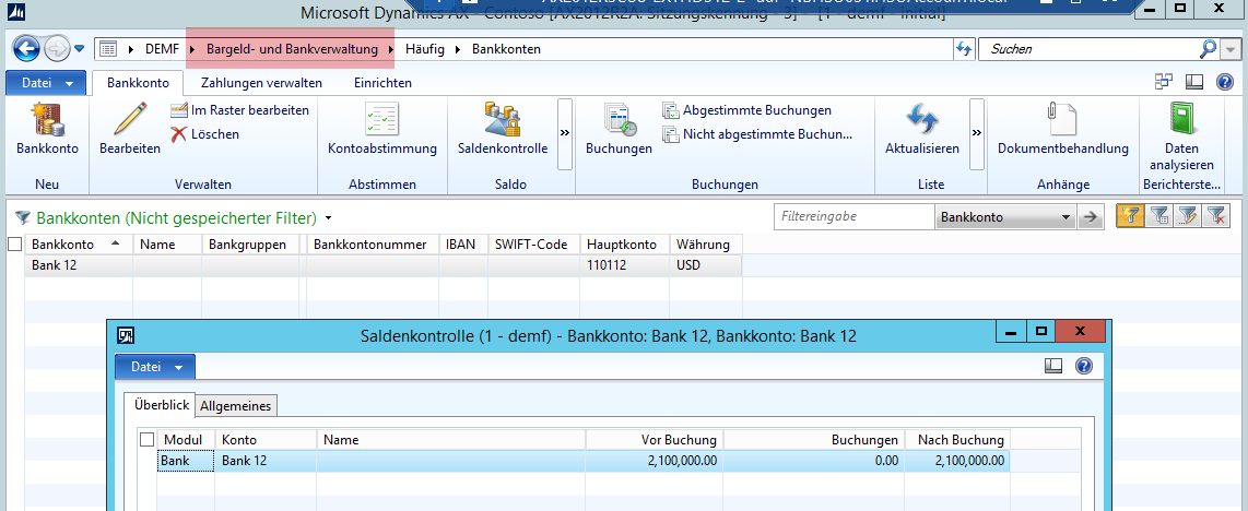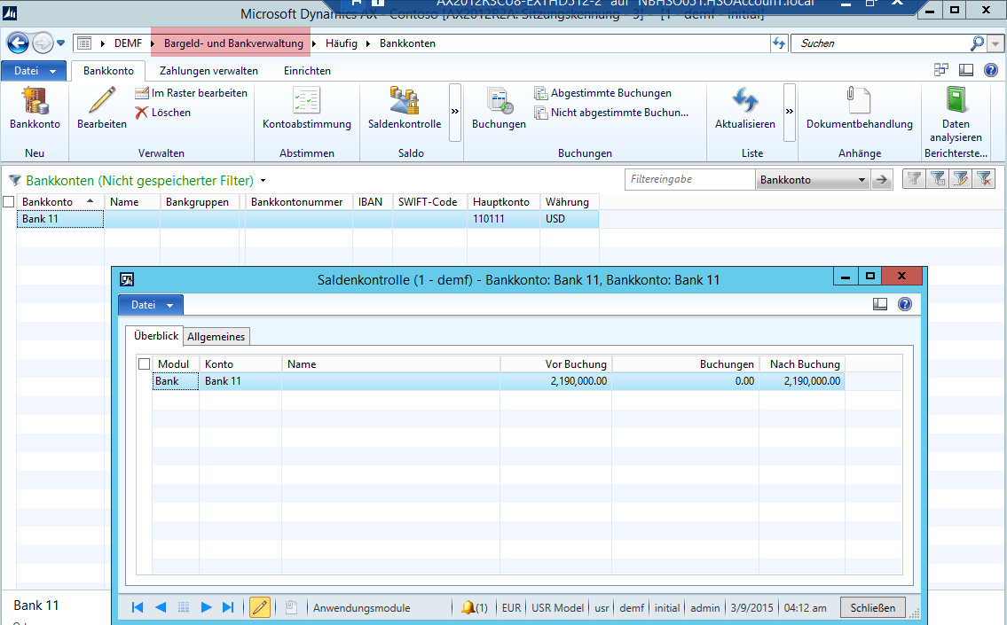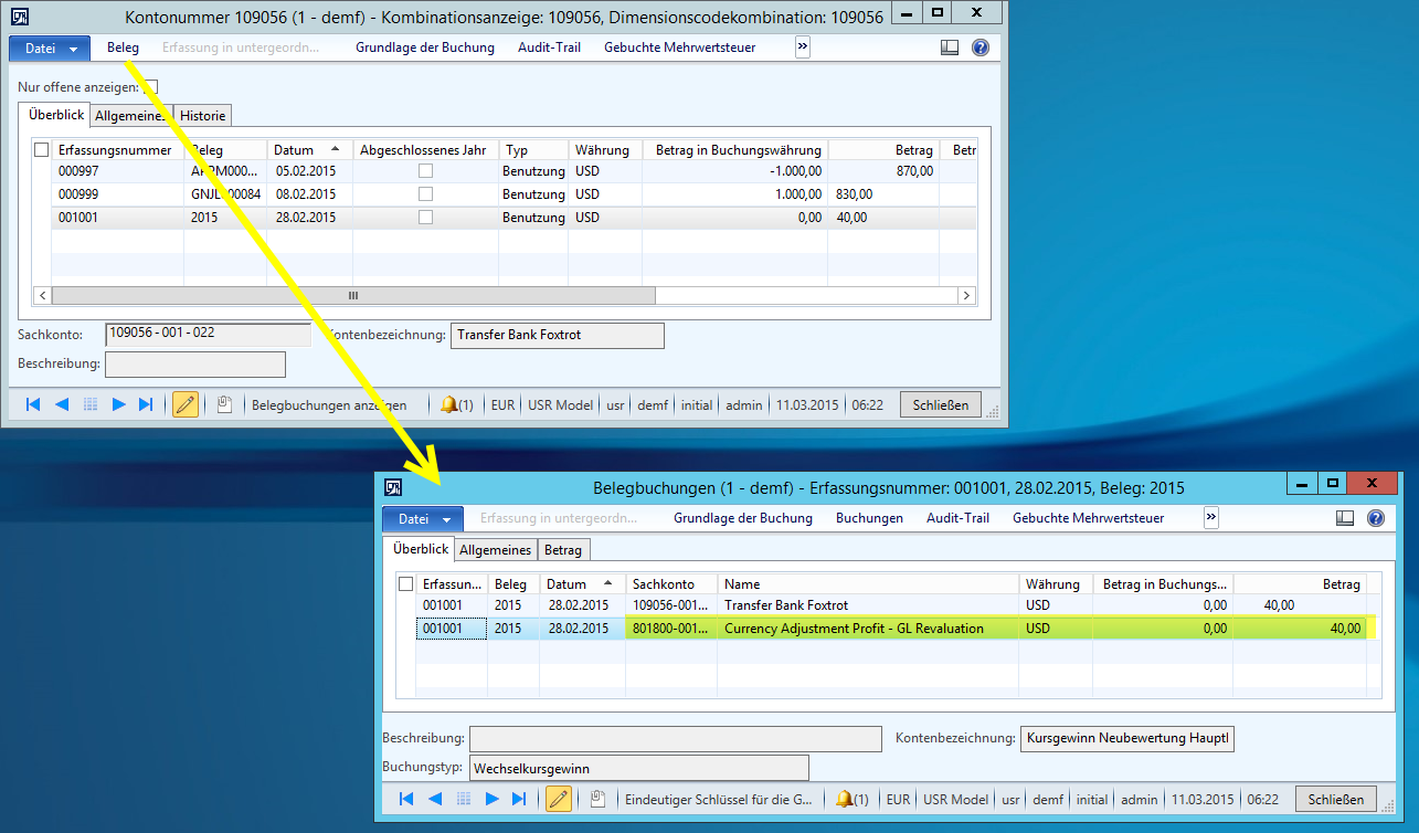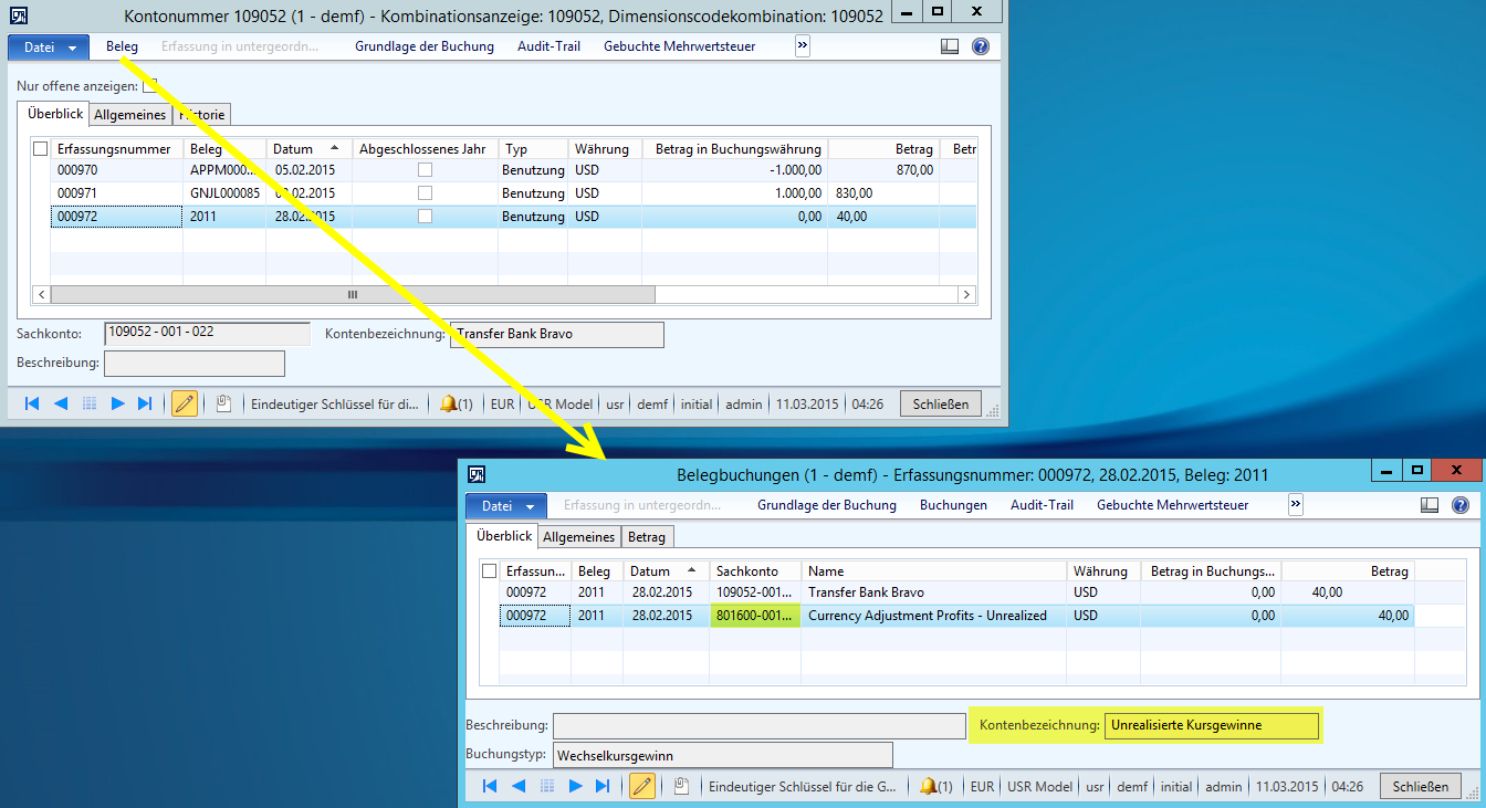 Am 5 Februar 2015 wird die Kreditorenrechnung schließlich durch eine Überweisung beglichen. Diese Überweisung wird wie im Standard von Dynamics AX üblich über ein Kreditorenzahlungserfassungsjournal durchgeführt. Da der Wechselkurs zum Zeitpunkt der Zahlung auf 87 EUR/100 USD gestiegen ist, ergibt sich aus der Zahlung in Höhe von 1000 USD bzw. 870 EUR ein Kursverlust in Höhe von 70 EUR. Dieser Verlust wird auf dem Konto für realisierte Kursverluste erfasst. Gleichzeitig wird der zuvor gebuchte unrealisierte Kursgewinn in Höhe von 50 EUR storniert. Die zugehörigen Buchungen sind in den folgenden beiden Screenshots dargestellt.