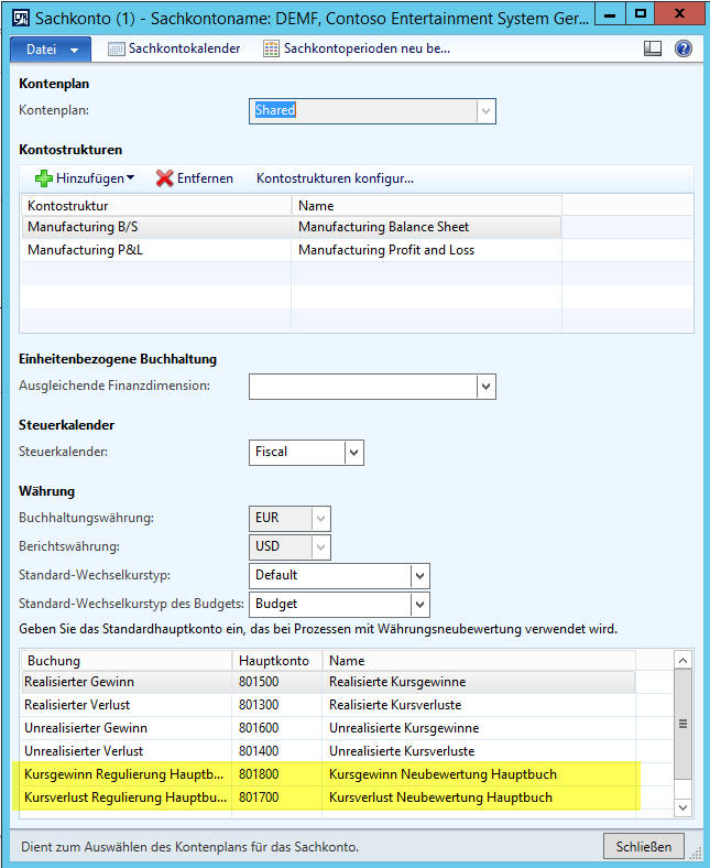 Im ersten Schritt werden die beiden Elemente „FinancialGain“ und „FinancialLoss“ des BaseEnums „CurrencyGainLossAccountType“ für die Länder Deutschland und USA bereitgestellt.