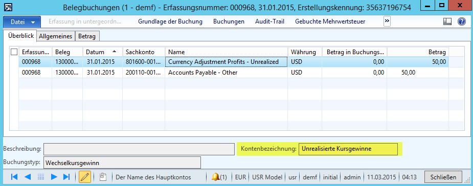 Da die Rechnung bis zum Monatsletzten noch nicht ausgeglichen ist, wird zum Ende des Monats Januar 2015 eine entsprechende Neubewertung der Fremdwährung durchgeführt. Dank des auf 75 EUR/100 USD gesunkenen Wechselkurses ergibt sich hieraus ein unrealisierter Wechselkursgewinn in Höhe von 50 EUR (1000 USD * [80/100 EUR/USD – 75/100 EUR/USD]), den Dynamics AX auf dem entsprechenden Sachkonto für unrealsisierte Kursgewinne bucht. Die zugehörige Buchung ist im folgenden Screenshot dargestellt.
