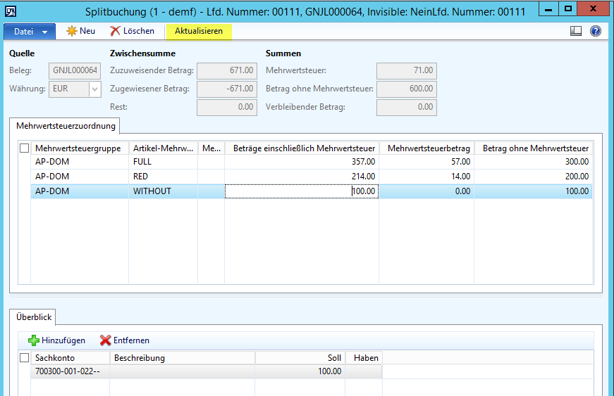 Schritt 3: Sobald sich die Soll- und Habenbeträge entsprechen, wird der Aktualisieren-Button aktiv, der es Ihnen erlaubt die Splitbuchungszeilen in das Journal zu übertragen.