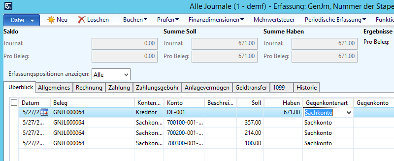 Vervollständigen Sie die Buchung indem Sie die zugehörigen Soll-Positionen eingeben wie dies im folgenden Screenshot dargestellt ist.
