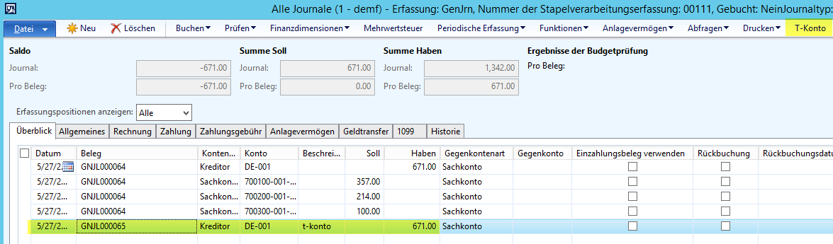 Schritt 3: Mit dem Schließen der T-Konto Maske werden die Buchungszeilen in das Journal übertragen