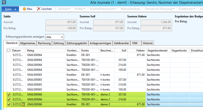 Hinweis: Wie aufgezeigt erlaubt Ihnen die T-Konto Maske eine größere Flexibilität in Bezug auf die Erfassung von Buchungszeilen. Im Gegensatz zur Splitbuchungsmaske ist es über die T-Konto Maske bspw. auch möglich andere Kontotypen (Debitoren, Kreditoren, Sachanlagen, usw.) auszuwählen. Darüber hinaus erfordert der Übertrag der Splitbuchungszeilen in das Buchungsjournal nicht, dass die Splitbuchung vollständig fertiggestellt ist wie die folgenden beiden Screenshots aufzeigen.
