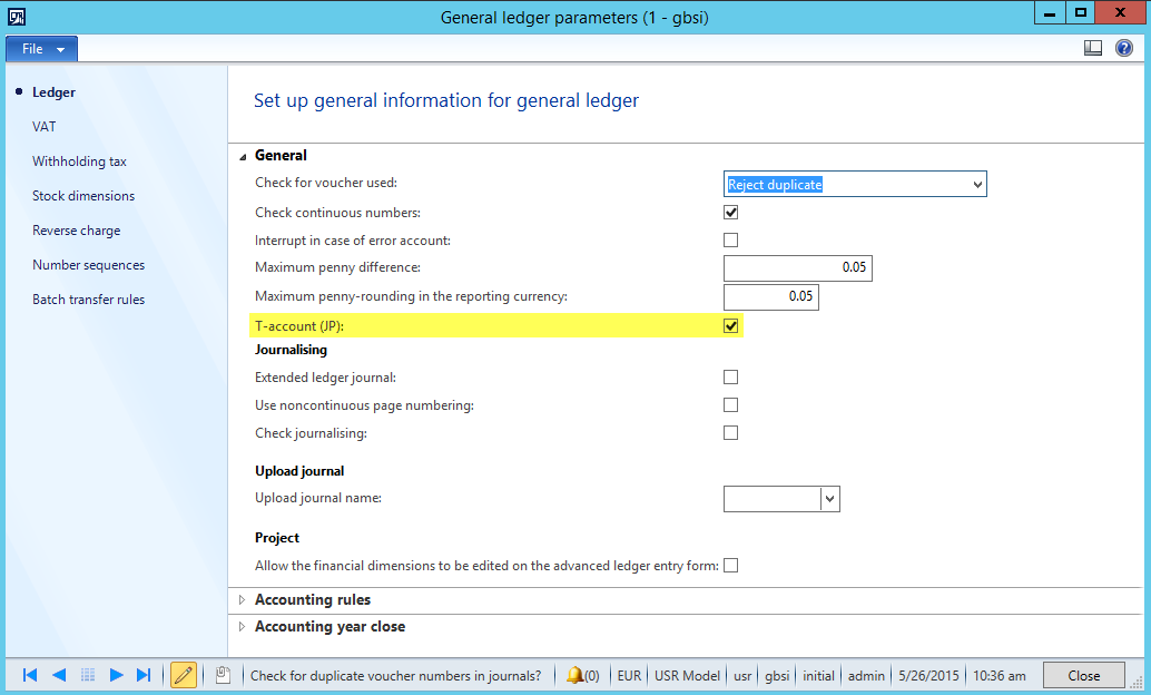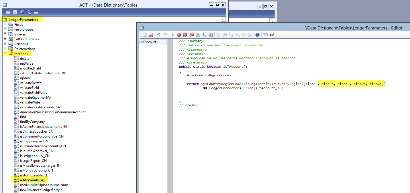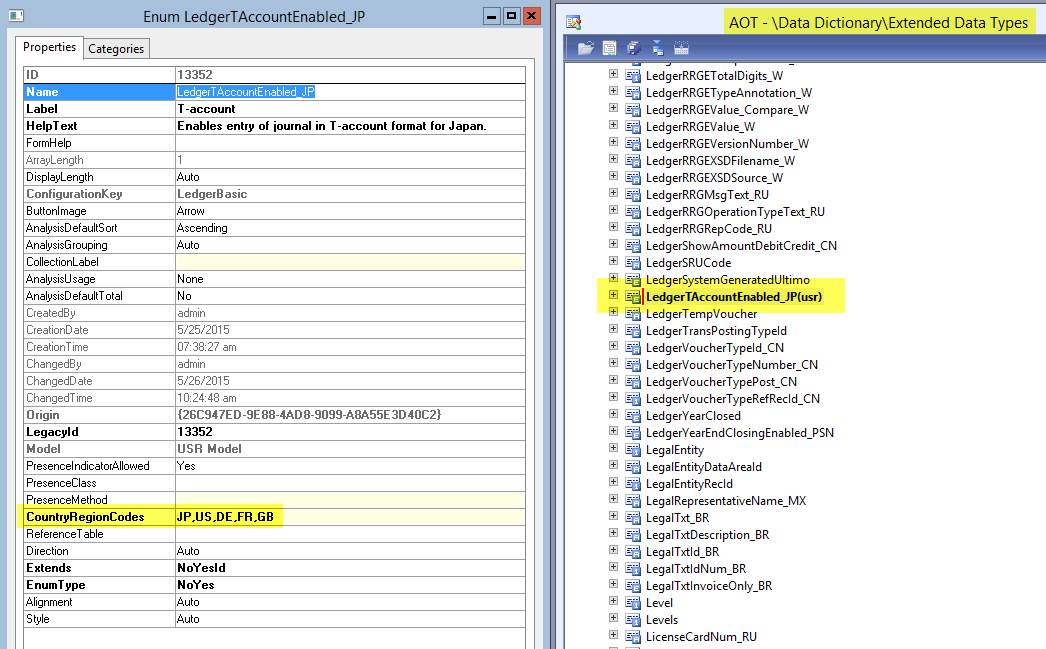 Modifikation 1: Aktivieren Sie den Extended Data Type “LedgerTAccountEnabled_JP” für die Länder in denen Sie diese Funktion benötigen.