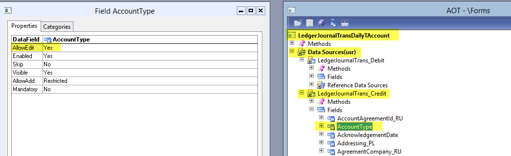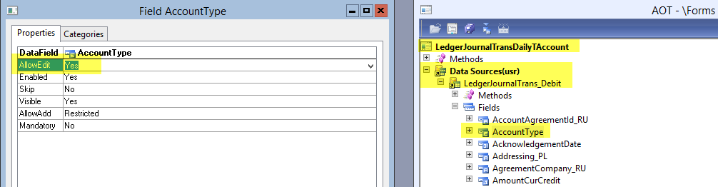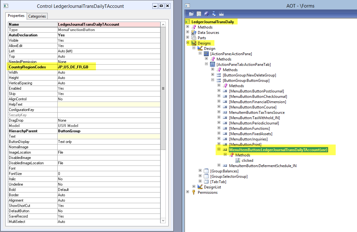 Modifikation 3: Aktivieren Sie die Länderschlüssel für den TAccount menu item button in der LedgerJournalTransDailyTAccount Maske wie nachfolgend dargestellt