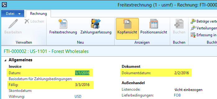 Interessanterweise werden in der Inkassimaske auch solche Transaktionen angezeigt, die in zukünftigen Perioden erfasst wurden. Um dies zu verifizieren habe ich eine Freitextrechnung über 1000 USD mit den folgenden Datumswerten erfasst und gebucht.