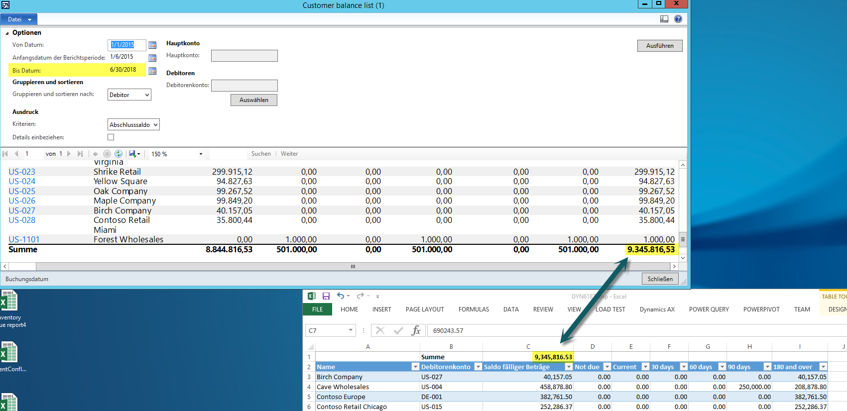 Aufgrund dessen besteht die einzige Möglichkeit der Abstimmung darin einen der im Standard verfügbaren Berichte entweder zum aktuellen Tagesdatum oder – bei bereits in zukünftigen Perioden gebuchten Transaktionen – zu einem in der Zukunft liegenden Datum abzustimmen nach dem keine weiteren Buchungen durchgeführt wurden. Ein Beispiel für eine solche mögliche Abstimmung ist im folgenden Screenshot festgehalten.DE_26_0018