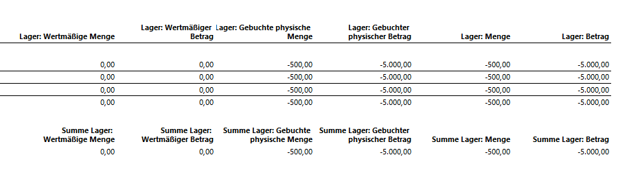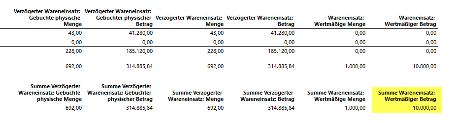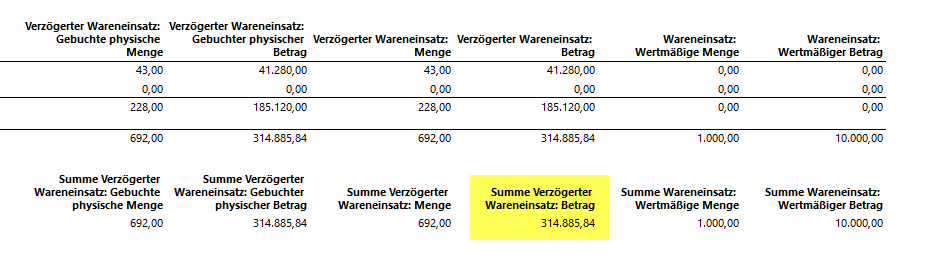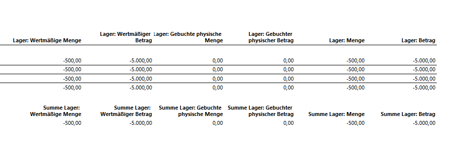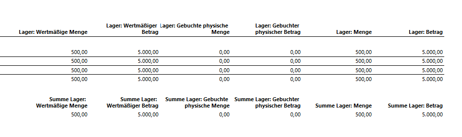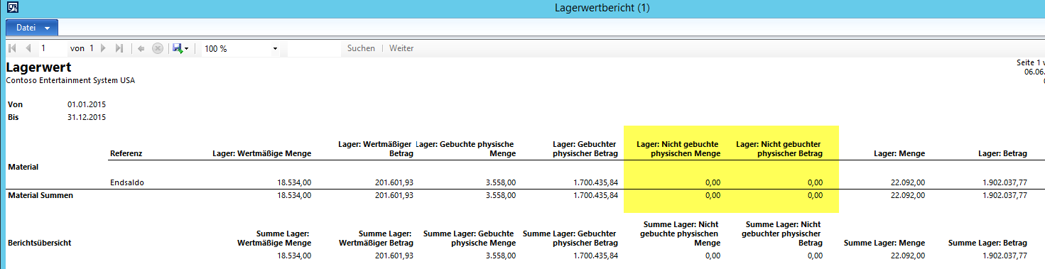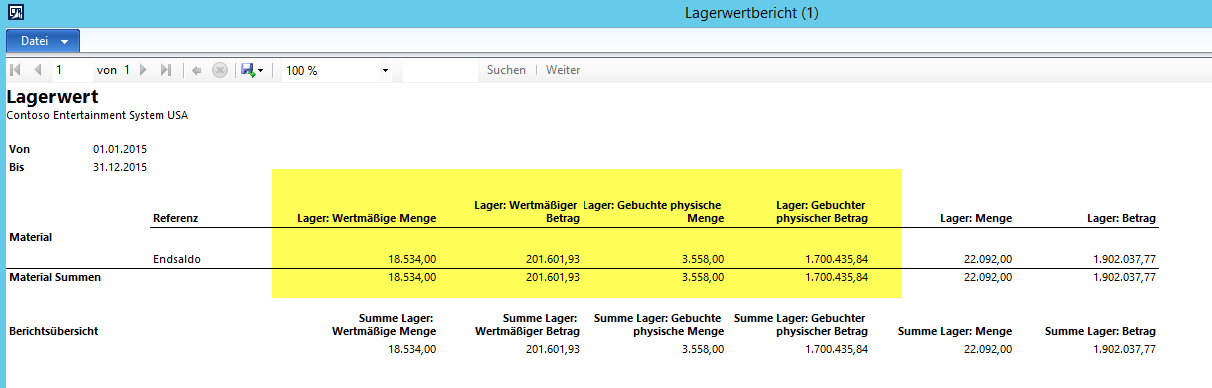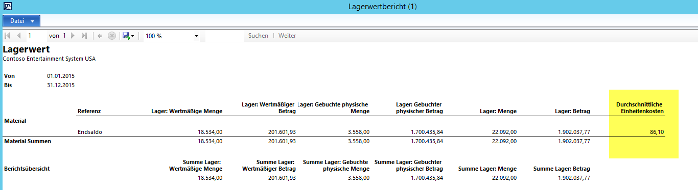 Mit der vorstehenden Datumseinschränkung wies der Lagerwertbericht nun die folgenden Daten aus: