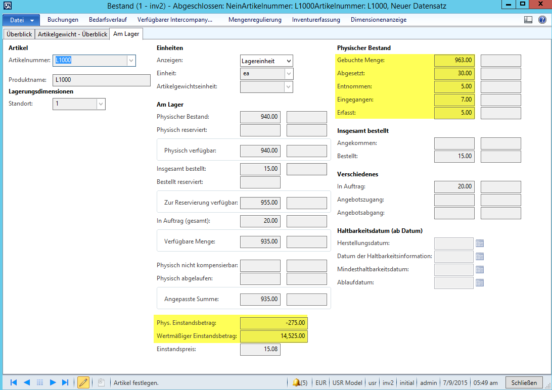 Aus den beiden vorstehenden Screenshots geht hervor, dass nur physisch bzw. finanziell aktualisierte Transaktionen Aufnahme in den Lagerwertbericht finden. Im Lager entnommene bzw. erfasste Bewegungen denen kein physischer oder finanzieller Wert zugeordnet ist finden im Lagerwertbericht dagegen keine Berücksichtigung.