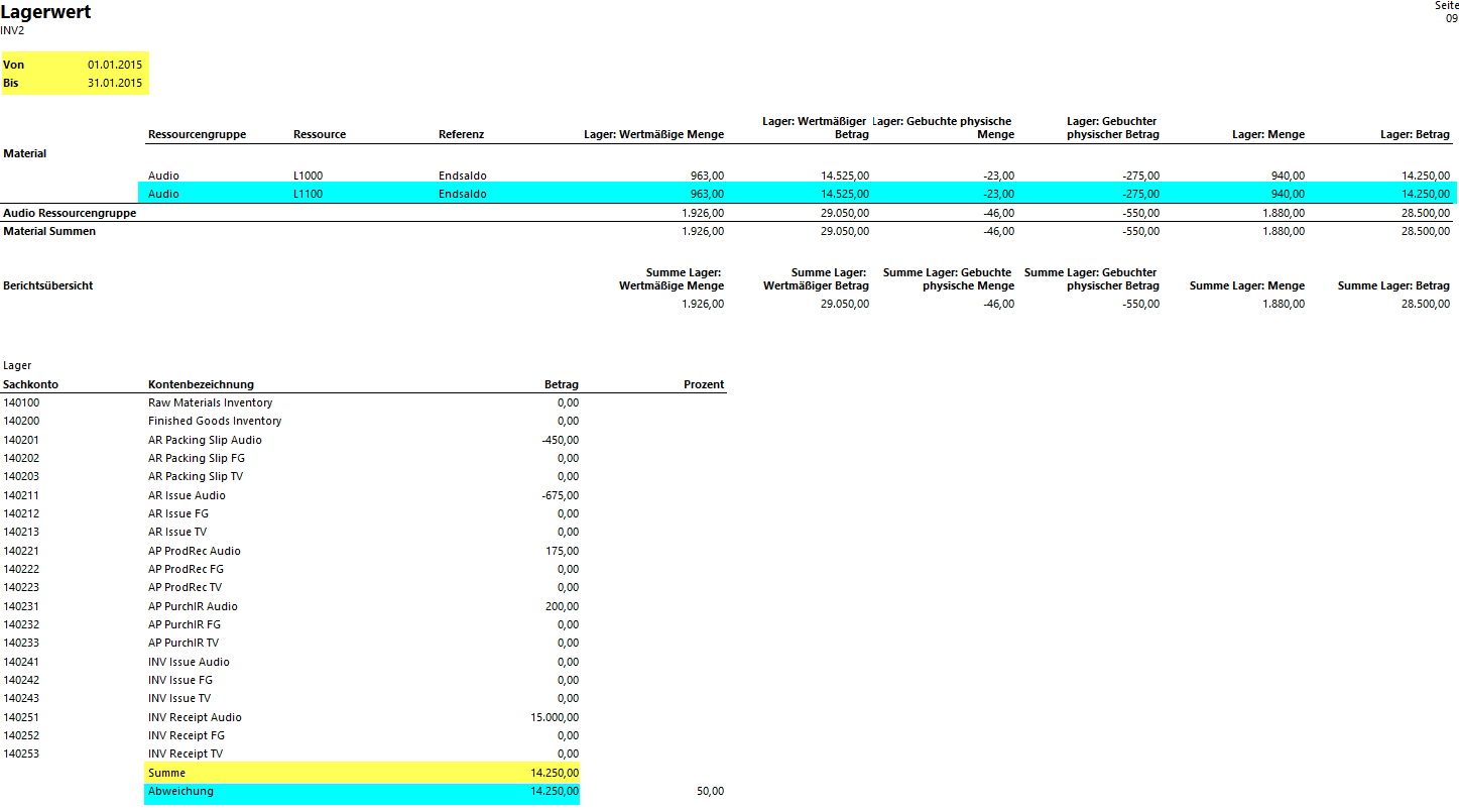 Dieses Ergebnis ist für die Lagerabstimmung sehr wichtig, da nur die am Berichtsende ausgewiesenen Sachkontensalden, nicht aber die Lagerbewegungen durch das eingegebene Datumsintervall zeitlich eingeschränkt werden. Dies erkennt man auch daran, dass im oberen Berichtsbereich der zweite Testartikel „L1100“ (blau hervorgehoben) ausgewiesen wird, obwohl alle Transaktionen für diesen zweiten Testartikel ausschließlich im Februar 2015 durchgeführt wurden.