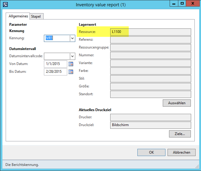 Um ausschließlich die Buchungen des ersten Testartikels „L1000“ zu analysieren, die im Januar 2015 erfasst wurden, habe ich den Lagerwertbericht wie folgt aufgerufen: