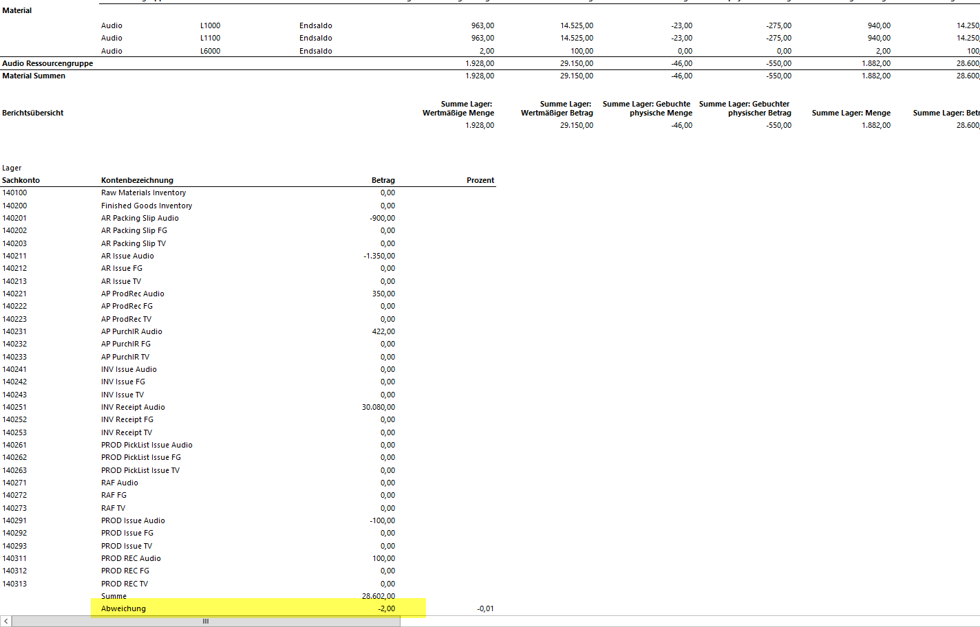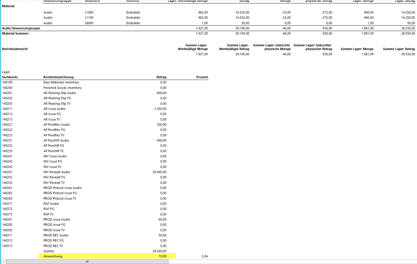 Die Ursache für die ausgewiesene Abweichung besteht darin, dass Dienstleistungsartikel grundsätzlich nicht im Lagerwertbericht ausgewiesen werden. Solange die Lieferantenrechnung für die Fremdfertigung nicht gebucht wurde sind die zur Produktion des Fertigartikels zugehörigen Buchungen demnach unvollständig, was zum Ausweis einer Abweichung im Lagerwertbericht führt. Bitte beachten Sie, dass der potentielle Konfliktebericht eine vergleichbare Abweichung in Höhe von 10 EUR ausweist.