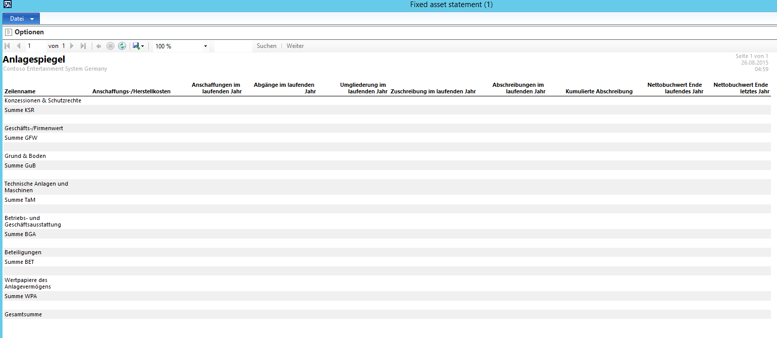 Vergleicht man die Struktur des DATEV-Anlagenspiegels mit der Struktur des Standard Dynamics AX Anlagenspiegels für Deutschland, so kann man – mit Ausnahme der geringfügig abweichenden Anordnung und Bezeichnung der Spalten – keinen wesentlichen Unterschied zwischen den beiden Anlagenspiegeln erkennen. Siehe hierzu auch den folgenden Screenshot, welcher neben dem standardmäßig vorgegebenen Spaltenaufbau eine vom Verfasser erstellte Beispiel-Zeilenstruktur des Standard Anlagenspiegels aufzeigt.