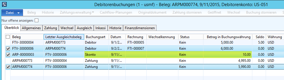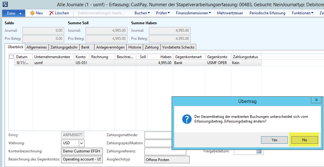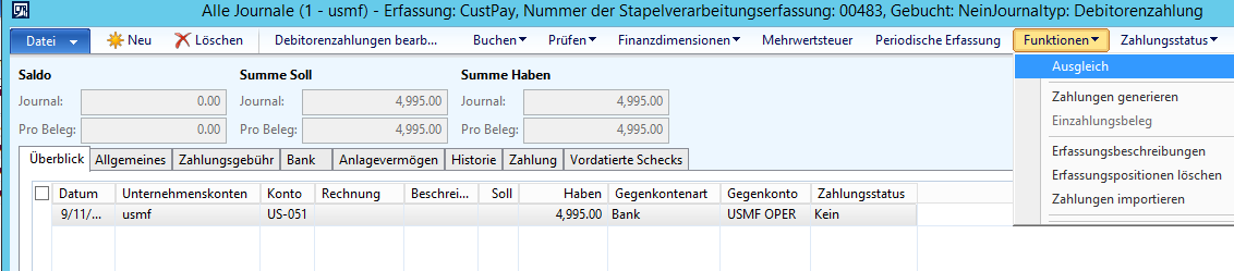 Nach Fälligkeit der offenen Position überweist der Kunde lediglich 4995 $, d.h. er zahlt 5 $ zu wenig. Die Kundenzahlung wird hierbei über ein Kundenzahlungserfassungsjournal erfasst und mit der offenen Position für den Ausgleich markiert wie dies in den folgenden beiden Screenshots dargestellt ist.