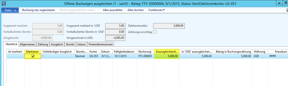 Beispiel: Nach Buchung einer Freitextrechnung über 5000 $ kann man in der Debitorenbuchungsmaske den folgenden Eintrag erkennen.