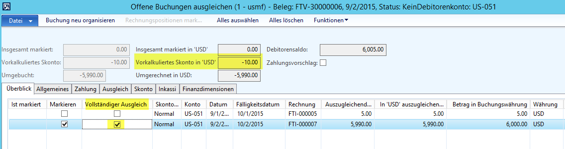 Im Unterschied zum vorherigen Beispiel wird nun allerdings der durch die Anpassungsprogrammierung neu hinzugekommene Parameter „vollständiger Ausgleich“ ausgewählt. Das Ergebnis dieser Parameterauswahl ist, dass die 10 $ Unterzahlung als gewährter Debitorenskonto klassifiziert und gebucht werden. (Hinweis: Das für diese Buchung verwendete Sachkonto stammt hierbei aus den im Hauptbuch eingestellten Automatikkonten).