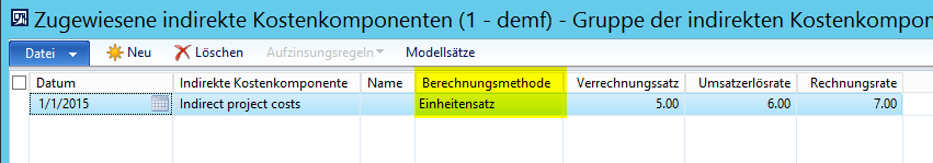 Diese Kostensätze definieren, dass für jede gebuchte Projektstunde zusätzlich 5 EUR an indirekten Kosten, 6 EUR an Erlösabgrenzung bzw. 7 EUR an den Kunden berechnet bzw. gebucht werden.