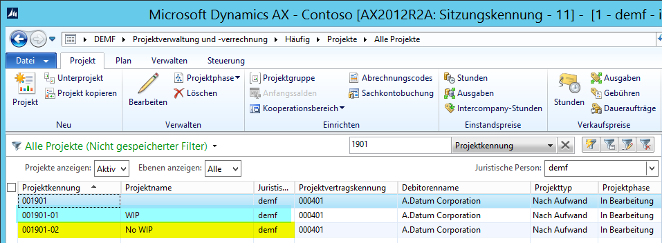 Hinweis: Aus Vereinfachungsgründen wird nachfolgend das Projekt mit den Bilanz-Buchungseinstellungen als „WIP-Projekt“ und das Projekt mit den GuV-Buchungseinstellungen als „Nicht-WIP“ bzw. „gewöhnliches“ Projekt bezeichnet.