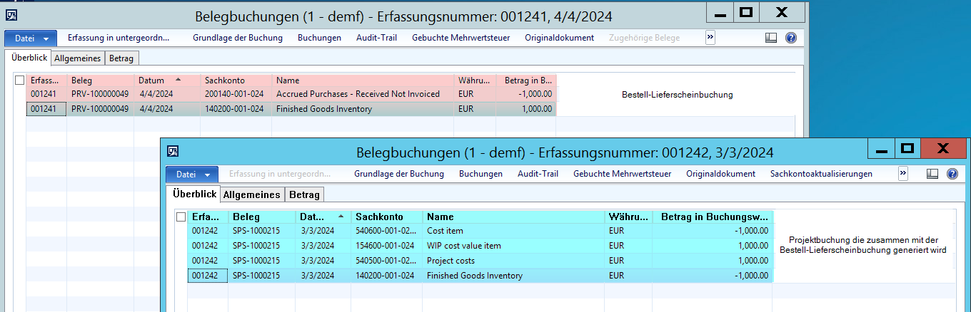 Für das Aufwandsprojekt mit WIP-Buchungen werden hierbei die folgenden beiden Buchungsbelege generiert: