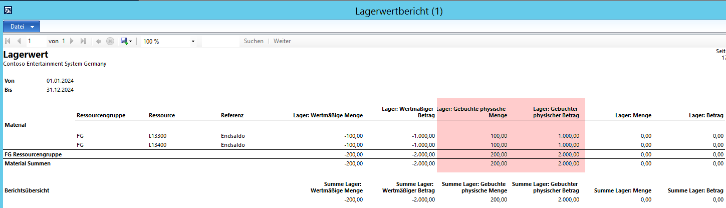 Der nächste Screenshot zeigt den Inhalt des Lagerwertberichts nach Durchführung der Bestell-Lieferscheinbuchung auf.