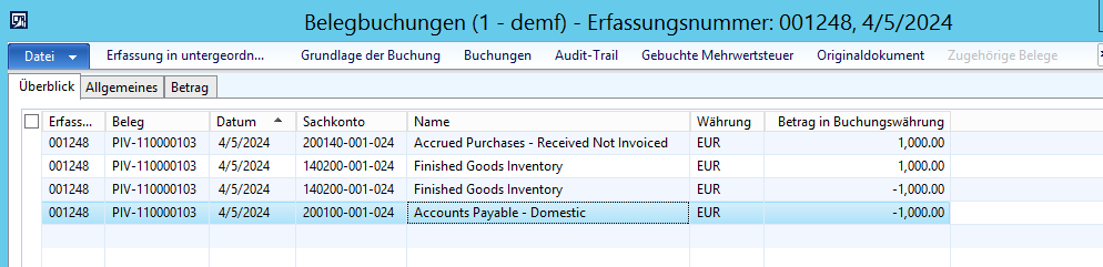 Im nächsten Schritt habe ich die Bestellrechnung gebucht. Hierbei wurde der folgende Buchungsbeleg sowohl für das gewöhnliche Aufwandsprojekt als auch das WIP-Projekt erstellt: