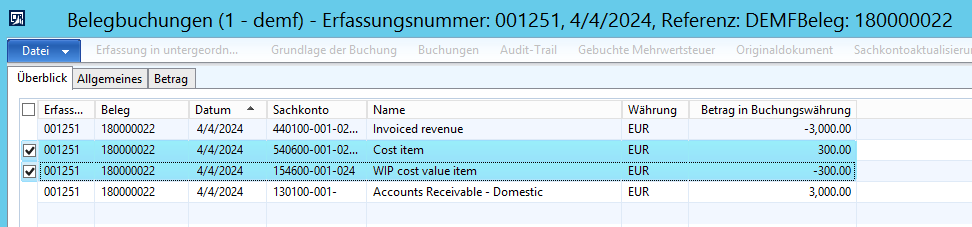 Hinweis: Der erste Artikel (“L13300”) wurde für das WIP Aufwandsprojekt verwendet und der zweite Artikel (“L13400”) für das gewöhnliche Aufwandsprojekt.