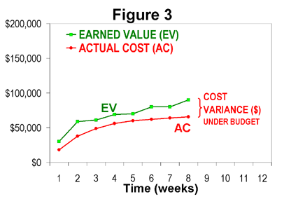 Um langfristig laufende Projekte controllen zu können ist demnach eine Messgröße erforderlich, welche über den aktuellen Projektfortschritt Auskunft gibt. Der sog. „earned value“ (EV) stellt eine solche Größe dar und erlaubt es die IST-BUDGET Abweichung in eine Kostenabweichung („cost variance“) und Planabweichung („schedule variance“) aufzuteilen. Die beiden folgenden Screenshots stellen diese Abweichungsgrößen beispielhaft dar.
