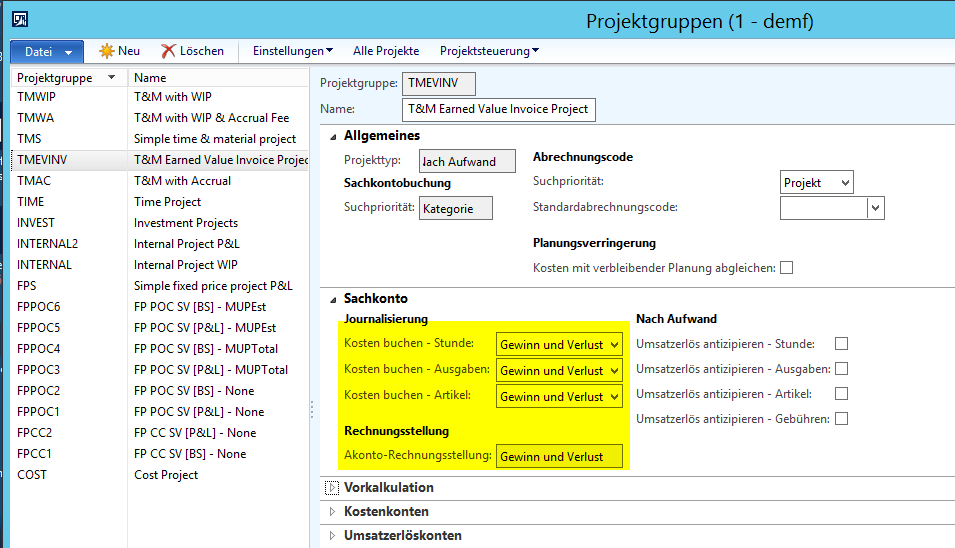 Neben den Projekt- und Projektbuchungseinstellungen wurden die weiteren folgenden Einstellungen für die Abbildung des EVM Konzeptes vorgenommen: