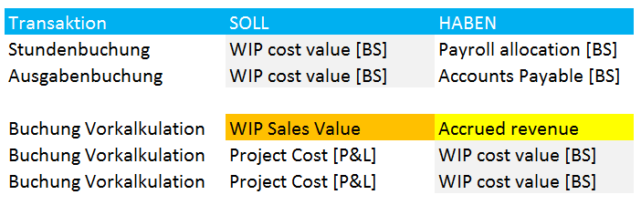 Option 1: Verwendung eines Bilanzkontos für das WIP und eines GuV-Kontos für das Erlösabgrenzungskonto. Vorteil: Der Vorteil eines solchen Setups besteht darin, dass eine solche Buchungseinstellung eine periodengerechte Gegenüberstellung von Kosten und Erlösen und somit eine detaillierte Analyse des Projektfortschritts erlaubt. Nachteil: Ein wesentlicher Nachteil dieses Lösungsansatzes besteht darin, dass viele Länder eine derartige „fiktive“ Erlösabgrenzung bzw. Erlösgenerierung nicht erlauben.