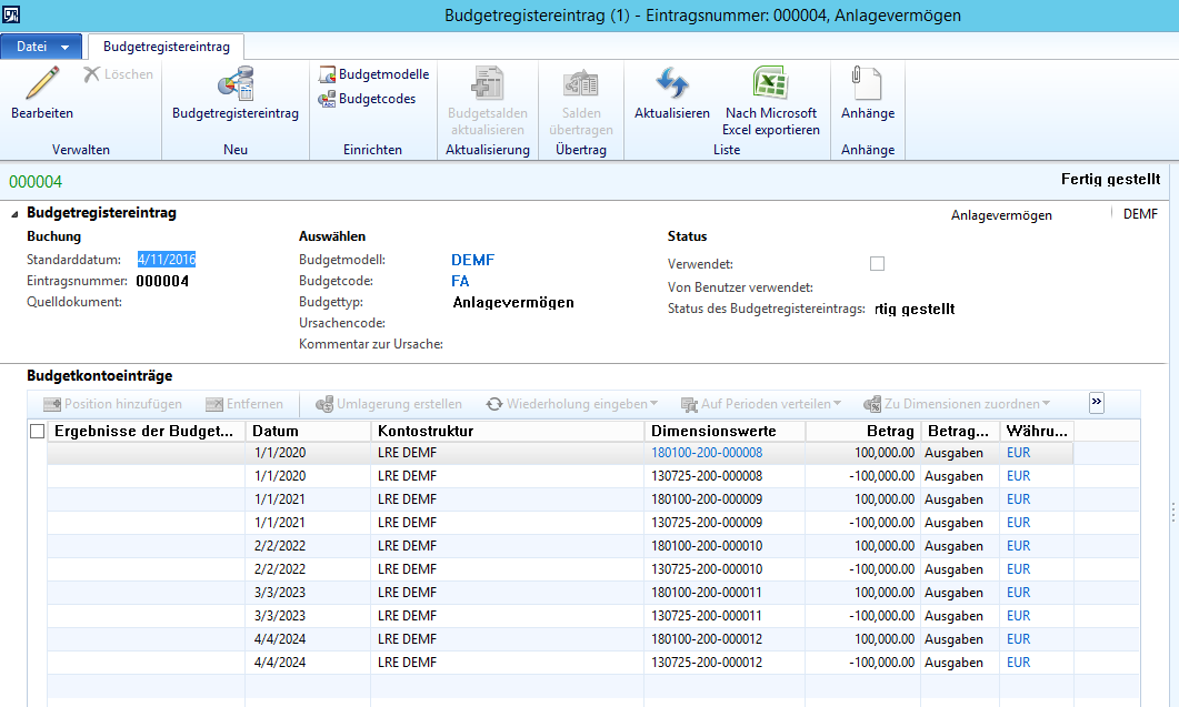 Hinweis: Da die Codeanpassung keinerlei Auswirkung auf die zuvor erfassten und aktualisierten Budgets hatte, wurde eine neue Sachanlage mit einem neuem Budget angelegt bzw. versehen.