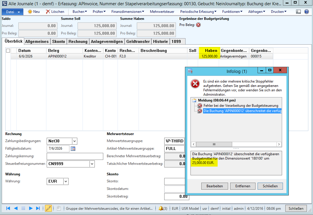 Vor dem Hintergrund dieser Einstellungen wurde nun eine neue Kreditorenrechnung mit einem Betrag erfasst, der über dem budgetierten Betrag liegt. Interessanterweise unterbricht nun Dynamics AX die Buchung mit einem entsprechenden Hinweis auf die Budgetüberschreitung, wie dies im folgenden Screenshot aufgezeigt ist.