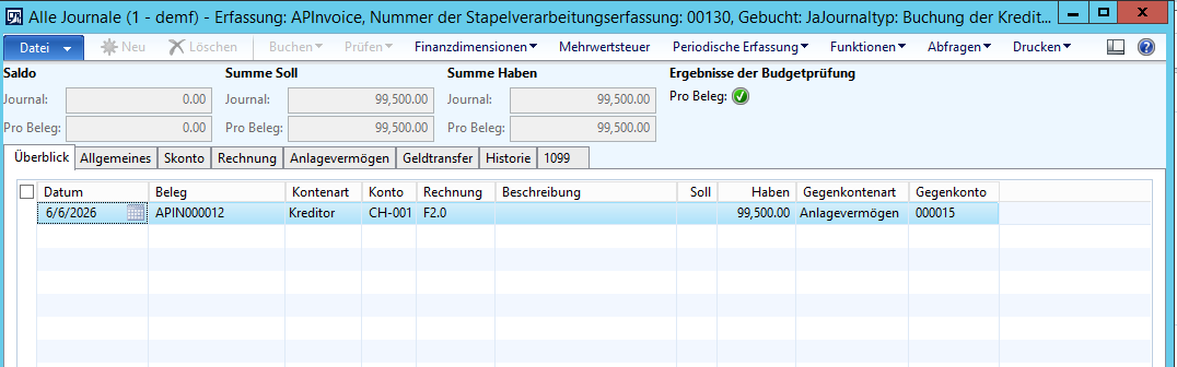 Ungeachtet dieser Tatsache habe ich nach der Erfassung der Budgetbeträge für meine Sachanlagen eine entsprechende Kreditorenrechnung über die Anschaffung des Anlagenguts erfasst und versucht diese zu buchen. Interessanterweise hat Dynamics AX den Beleg unmittelbar durchgebucht und die Sachanlage aktiviert, obwohl der Buchungsbetrag den budgetierten Betrag um 25000 EUR überstieg.
