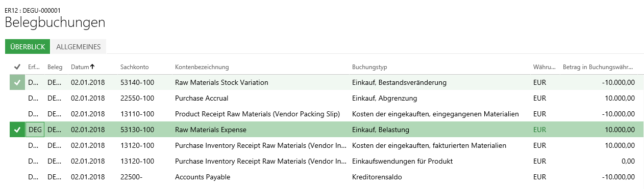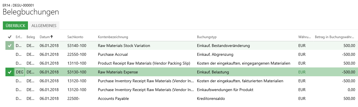 - die Konteneinstellungen im Bereich „Kosten der eingekauften, eingegangenen Materialien“ und im Bereich „Einkaufsaufwendungen nicht fakturiert“, sowie