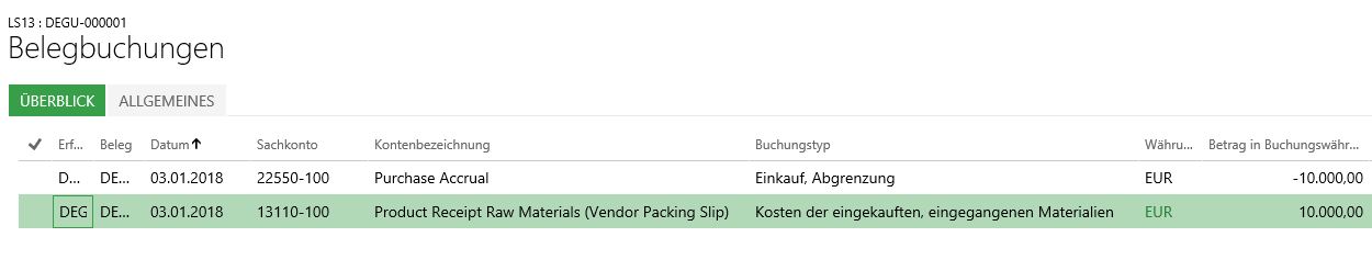 Wie weiter oben erwähnt sorgen die verwendeten Belastungsbuchungen dafür, dass auch im Falle von Rücklieferungen an Lieferanten Materialaufwands- und Bestandsveränderungsbuchungen durchgeführt werden. Mit der Lieferscheinbuchung kommt es demnach bilanztechnisch zu einer entsprechenden Reduzierung der Lagerzugangs- und Einkaufsabgrenzungskonten (siehe die folgenden beiden Screenshots).