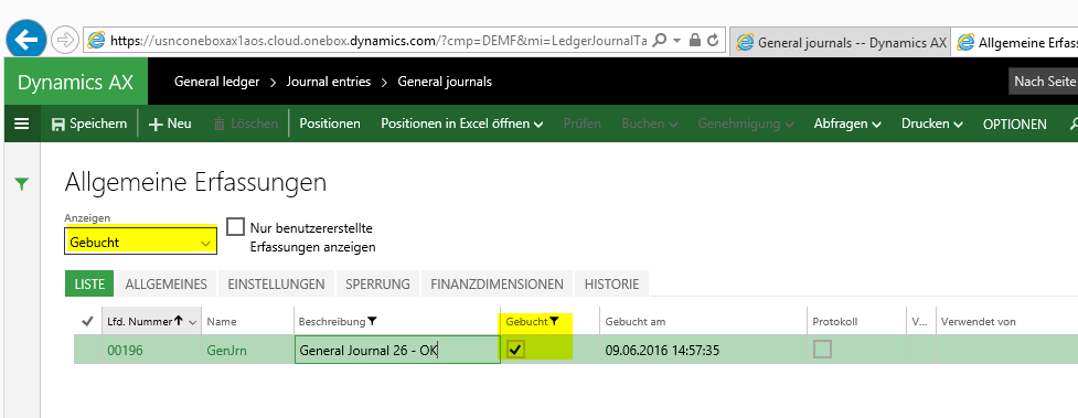 Wie zuvor blieben auch in diesem Fall die beiden vorherigen vollständigen bzw. teilweise fehlerhaften Journale bzw. Journalzeilen ungebucht stehen; neu angelegte fehlerfreie Journale – im Beispiel Journal Nr. 196 – wurden allerdings gebucht, wie die folgenden beiden Screenshots aufzeigen.