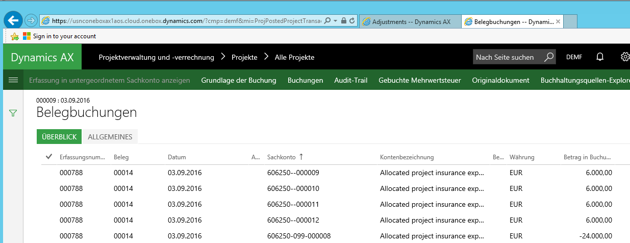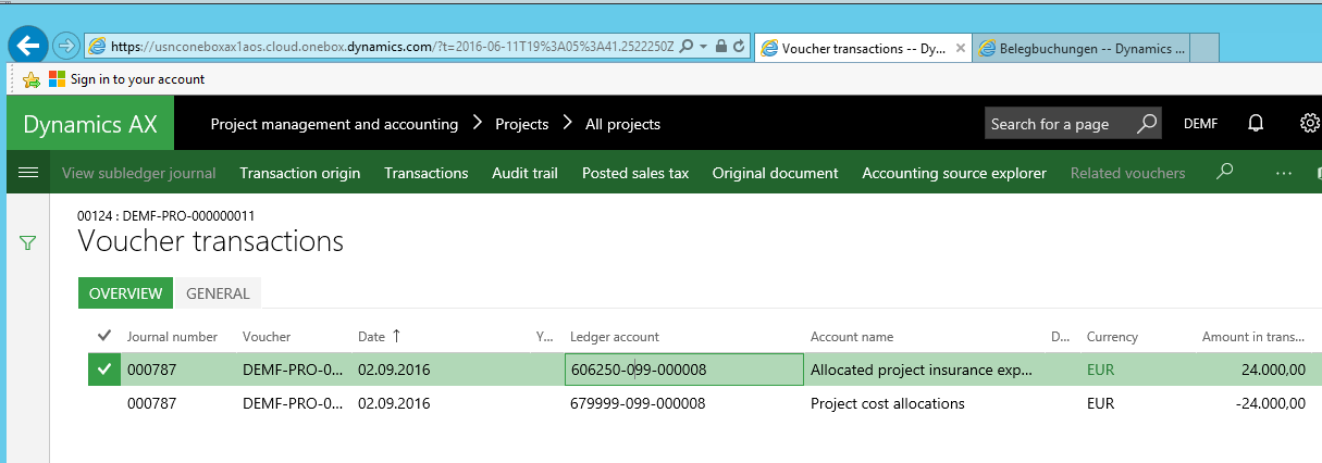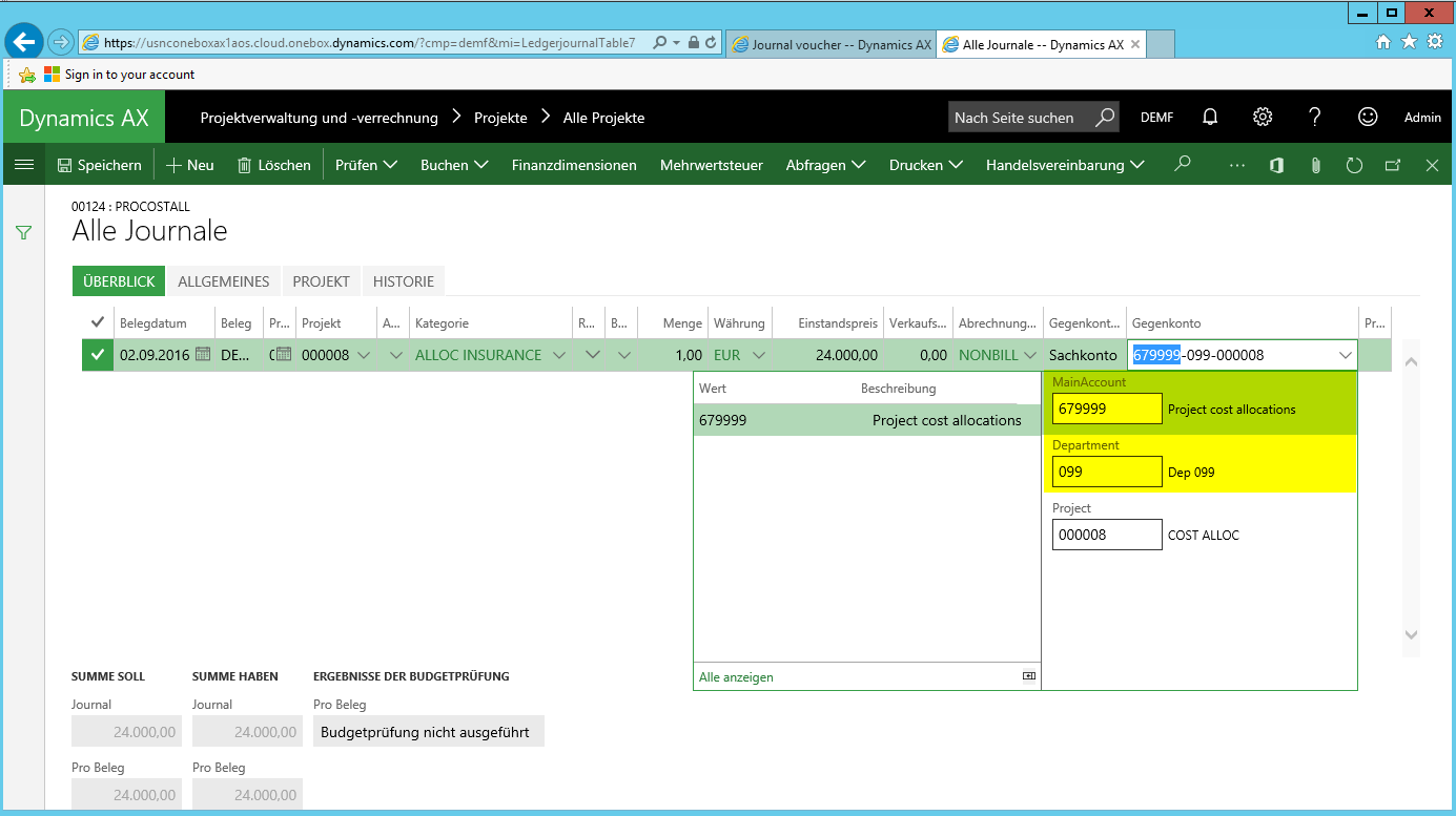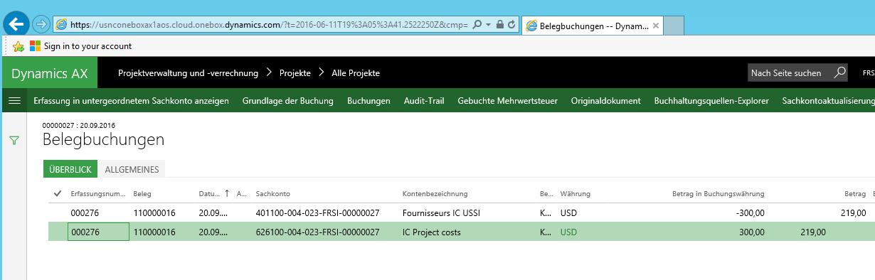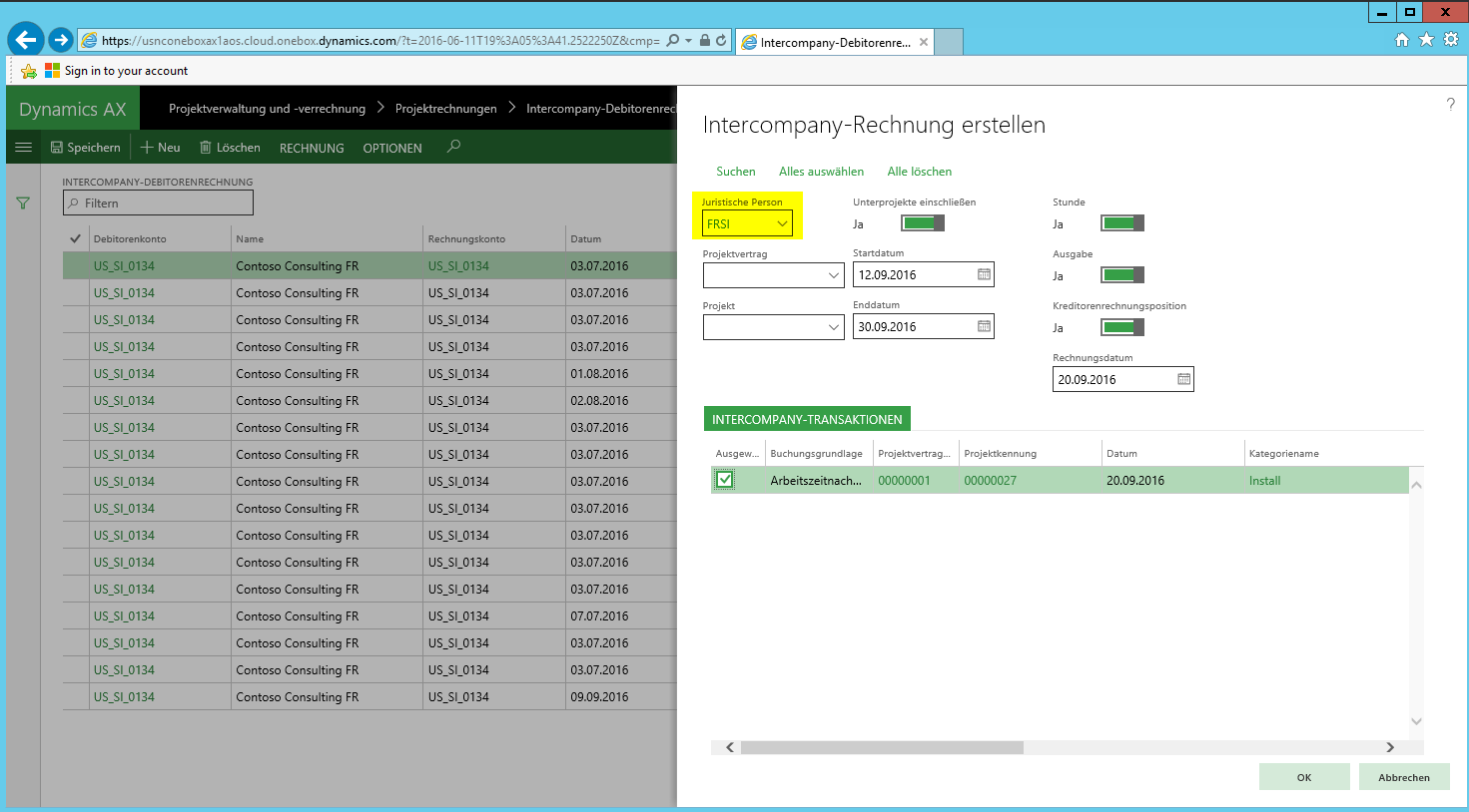 Hinweis: Die anderen an dieser Stelle verwendeten Finanzdimensionen (Abteilung 0023 & Projekt 0000027) sind für die Verarbeitung und Buchung der Zeiten auf intercompany Projekten nicht zwingend erforderlich. Aus Darstellungsgründen wurden diese beiden Größen allerdings an dieser Stelle mit aufgenommen.
