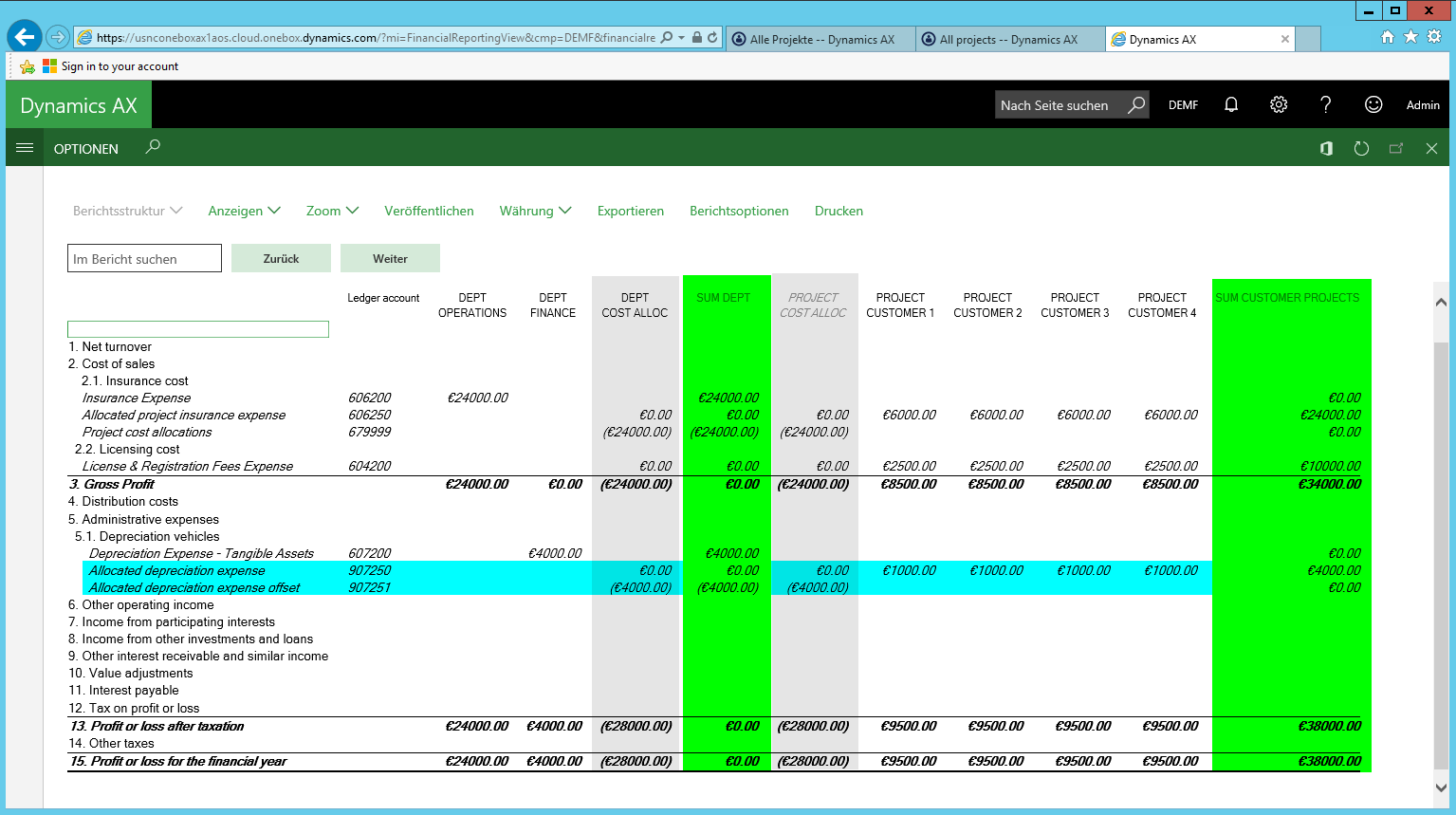 - Drittens, dass ein Vergleich der Kosten und intercompany Erlöse – im folgenden Screenshot grün hervorgehoben – eine Verifizierung der Angemessenheit der angewandten intercompany Verrechnungspreise gegenüber externen Adressaten wie Wirtschafts- und Steuerprüfern ermöglicht.