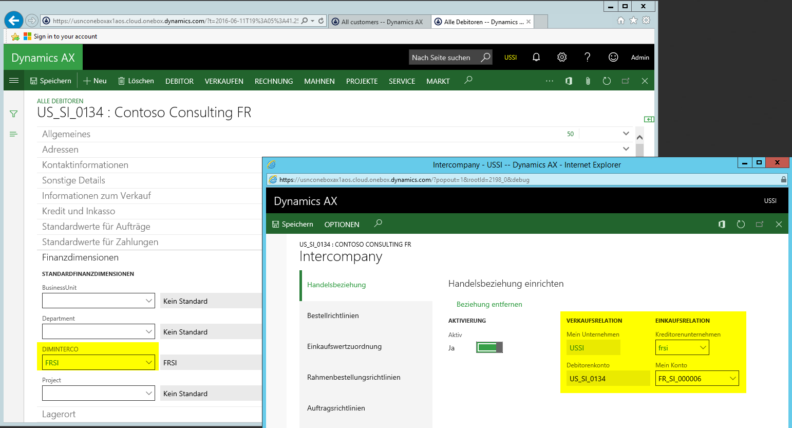 Zunächst ist es erforderlich in den Firmen USSI und FRSI entsprechende Kunden- und Lieferantenkonten anzulegen, welche über die Standard intercompany Funktion miteinander verknüpft werden, wie dies im folgenden Screenshot aufgezeigt ist.