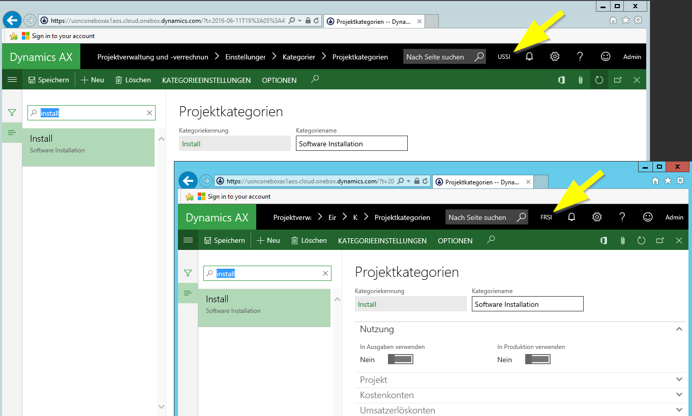 Ausgangsbasis für dieses erste Beispiel ist eine Mitarbeiterin, die in der Firma USSI angestellt ist und für ein Kundenprojekt das in der Firma FRSI angelegt ist eine Softwareinstallation durchführt. Damit diese Mitarbeiterin ihre Zeiten auf das entsprechende Kundenprojekt in der Firma FRSI erfassen kann sind die folgenden Einstellungen erforderlich.