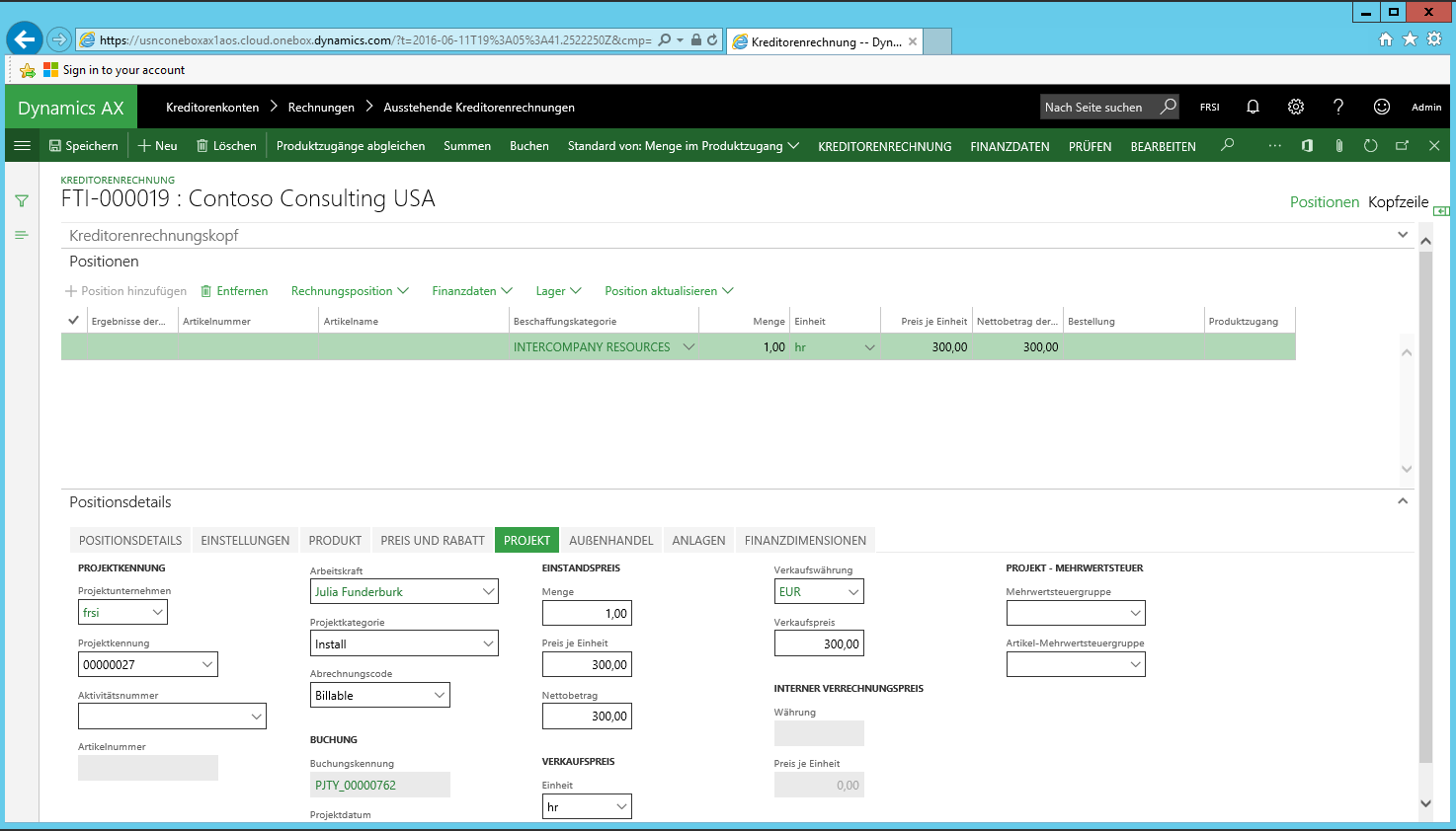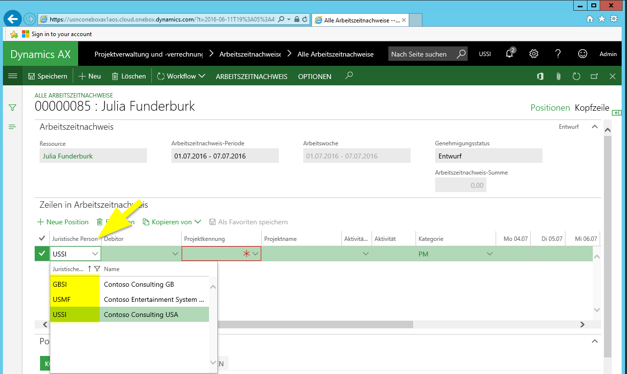 Nachdem alle zuvor aufgeführten Einrichtungsschritte abgeschlossen wurden, kann die Mitarbeiterin der Firma USSI über die Arbeitszeitnachweismaske das zugehörige Projekt in der Firma FRSI auswählen und ihre Zeiten hierauf buchen. Zu beachten ist in diesem Zusammenhang dass die Finanzdimensionen, die auf dem Projekt hinterlegt wurden automatisiert in den Arbeitszeitnachweis übertragen werden, wie dies im folgenden Screenshot aufgezeigt ist.