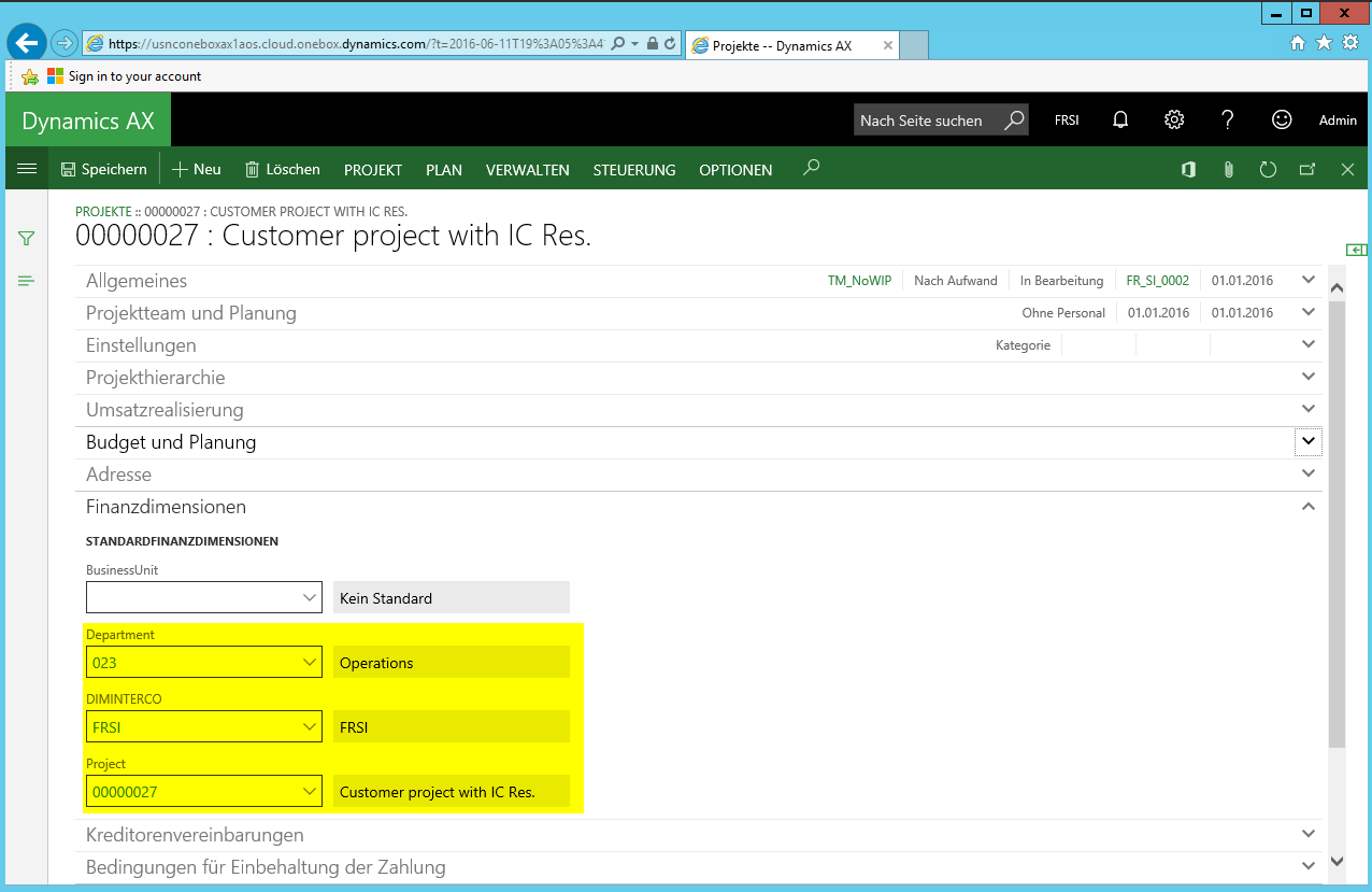 Bei der Projekteinrichtung in der Firma FRSI – auf welches später die entsprechenden Zeiten gebucht werden sollen – ist darauf zu achten, dass diese Einrichtung mit Hinterlegung einer entsprechenden intercompany Finanzdimension erfolgt. Andernfalls wird eine spätere Identifikation und Trennung von intercompany Kosten und Erlösen z.B. im Rahmen der Konsolidierung erheblich erschwert.