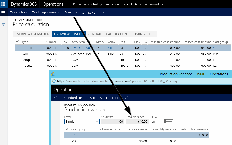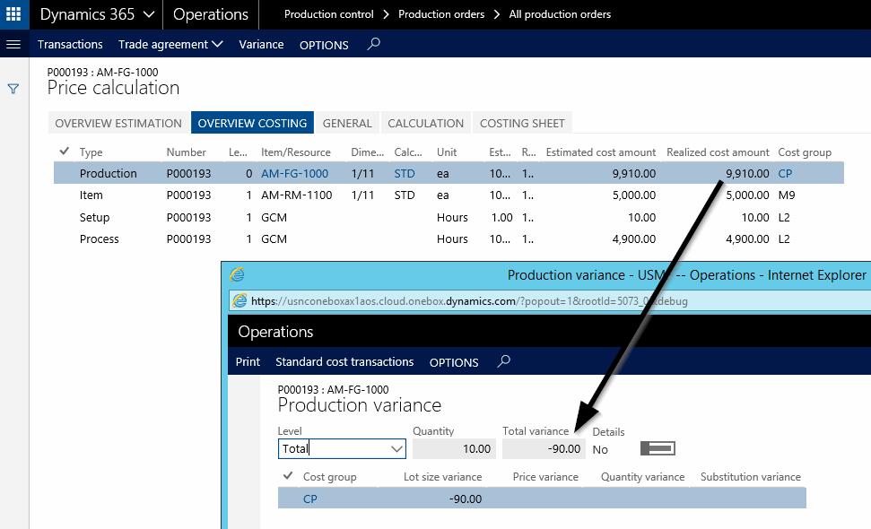 Werden nun von dem Fertigprodukt insgesamt 10 Stück gefertigt, so entstehen insgesamt Kosten in Höhe von $9910 [10$ Rüstkosten + 10 x ($500 Materialkosten + $490 Arbeitskosten)]. Die im folgenden Bildschirmdruck dargestellte Losgrößenvarianz in Höhe von $90 ist Ausdruck des weiter oben aufgezeigten Fixkostendegressionseffekts.
