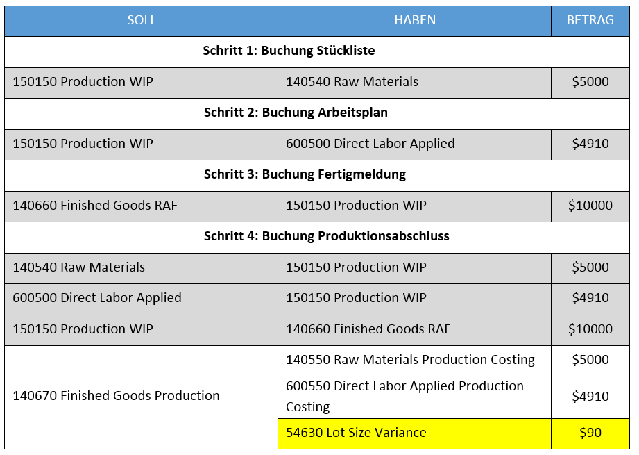 Aus der obenstehenden Übersicht kann man einen Fertigwarenbestand in Höhe von $10000 auf dem Sachkonto 140670 entnehmen. Um diese Fertigerzeugnisse herzustellen wurden insgesamt $5000 an Rohmaterialien und $4910 an Arbeitskosten verbraucht. Die verbleibende Differenz zu den Standardkosten wurden der Losgrößenabweichung auf dem Konto 540630 zugeordnet.