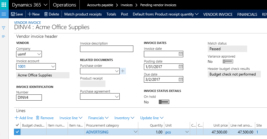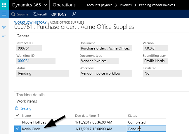 Nach Abschluss dieser Einrichtungstätigkeiten wird nun eine Rechnung über $47500 von der Buchhalterin Phyllis erfasst und der Workflow gestartet.