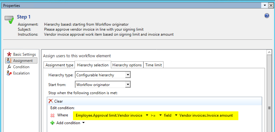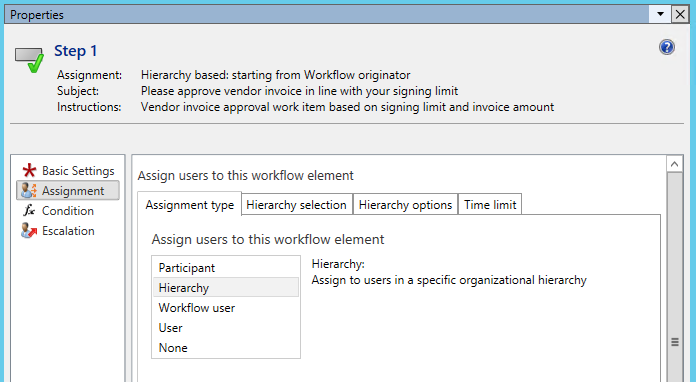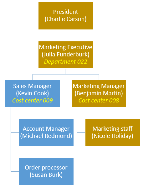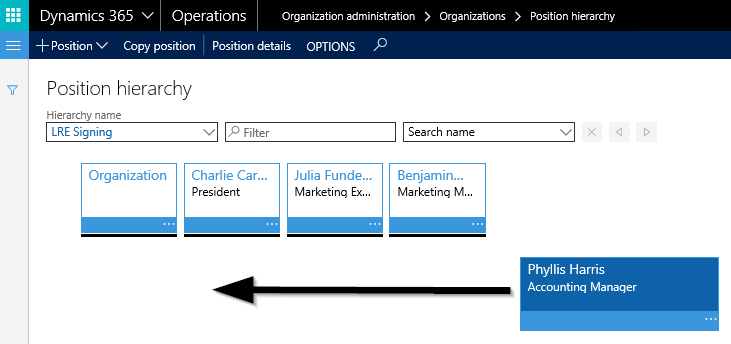 Dies liegt darin begründet, dass Kevin Cook nicht in der dem Workflow zugeordneten Positionshierarchie enthalten ist. Nun könnte man meinen, dass man Kevin Cook einfach in diese Hierarchie aufnehmen müsste um das Problem der richtigen Zuordnung zu beheben. Dies lässt sich aktuell allerdings nicht in Dynamics AX/365 for Operations realisieren, da lediglich eine einzige und eindeutige Beziehung zwischen den verschiedenen Positionen der Hierarchie möglich ist. Mit anderen Worten, die Tatsache dass Kevin Cook und Benjamin Martin beide die gleiche Vorgesetzte Julia Funderburk haben kann nicht in der verwendeten Positionshierarchie abgebildet werden.