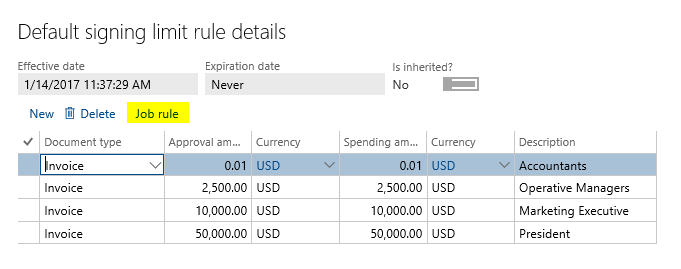 Nachdem der Workflow derart eingerichtet wurde, können im zweiten Schritt die eigentlichen Unterschriftsberechtigungen definiert werden. Die im folgenden verwendeten Limits, sind im folgenden Screenshot dargestellt.