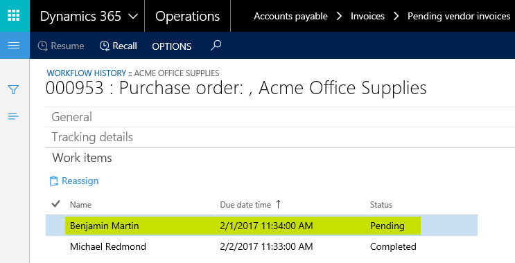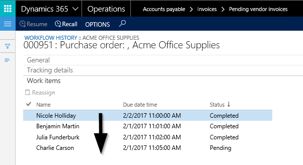 Unabhängig von dieser Tatsache konnte der hierarchische Workflowschritt immer den richtigen Genehmiger identifizieren. Der folgende Screenshot zeigt die vom Workflow angesprochenen Genehmiger für die dritte Rechnung über $47500 auf.