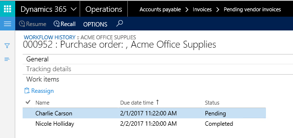 Wird mit diesen modifizierten Workfloweinstellungen erneut eine Rechnung in Höhe von $47500 erfasst, so werden nun weder den Kostenstellen-, noch den Abteilungsleitern entsprechende Workflowaufgaben zugeordnet, da deren Unterschriftslimit hierfür nicht ausreicht. Der folgende Screenshot stellt dies beispielhaft dar, bei dem nach Durchführung der sachlichen Rechnungsprüfung unmittelbar der Divisionsleiter (Charlie Carson) mit der Genehmigung der Rechnung betraut wird.