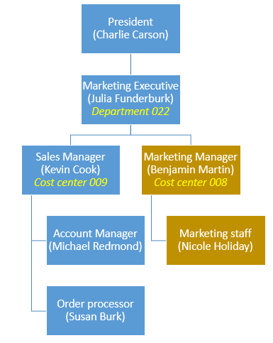 Bitte beachten sie, dass der Besteller (Nicole Holiday) über das Finanzdimensionsfeld des Mitarbeiters festgelegt wird. Der Kostenstellenverantwortliche (Benjamin Martin), der für die Genehmigung der Rechnung zuständig ist, wird über die Hinterlegung der Kostenstellenfinanzdimension festgelegt.